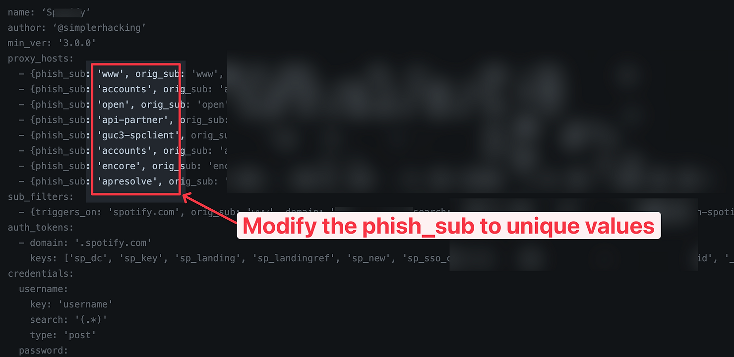 To change the subdomains used by the phishlet, go to the YAML file and modify the following fields. Example below: